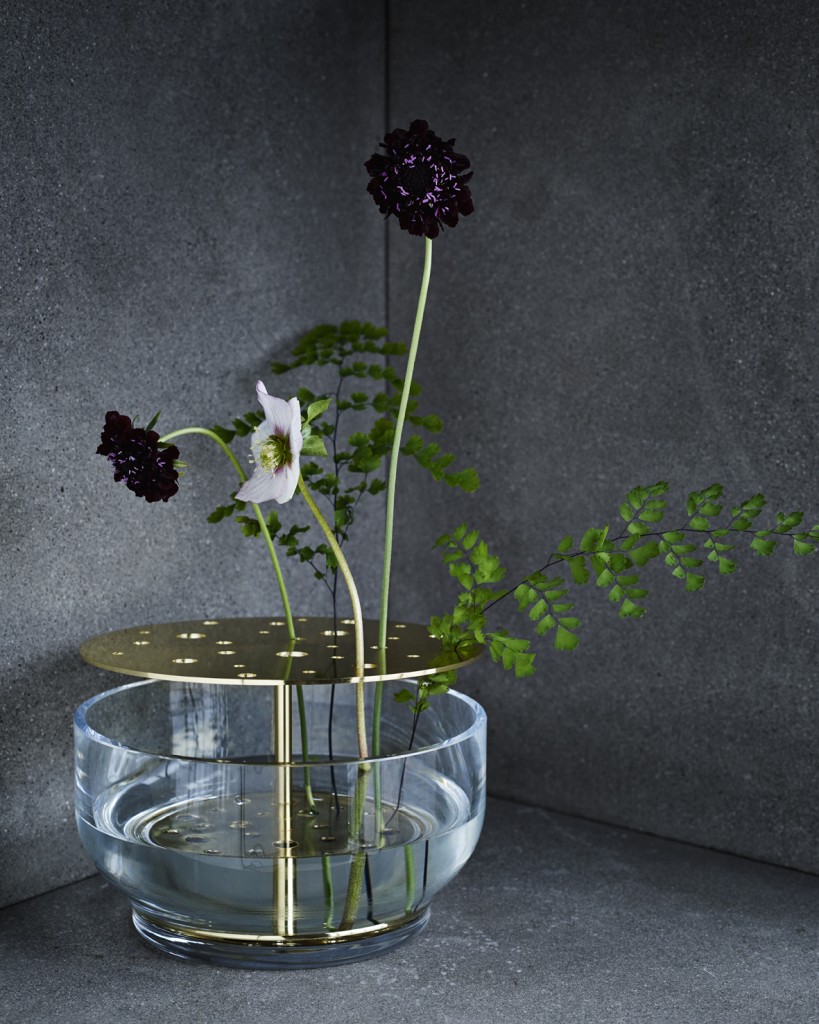 Un vase en verre soufflé avec une structure autonome en laiton aidant la fleur et sa tige